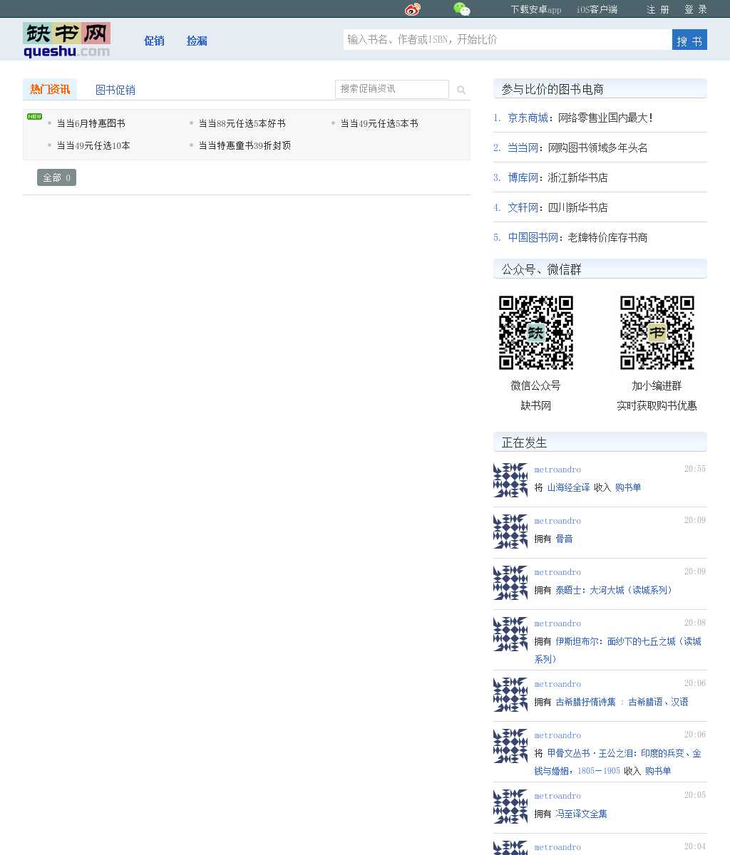 缺书网收入当当网、亚马逊、京东商城、博库网、文轩网等商城图书报价,图书比价技术领先,书目超全!还提供丰富的优惠券促销活动信息。