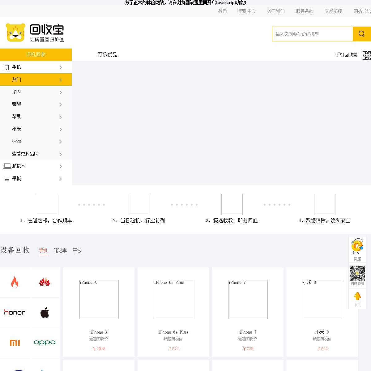 回收宝-专业的电子产品回收平台,为你提供手机回收、平板电脑回收、笔记本回收等二手数码产品回收业务。快速估计、专业检测、到账及时,专业的团队提供高价回收服务,并有数据粉碎,隐私安全有保障。