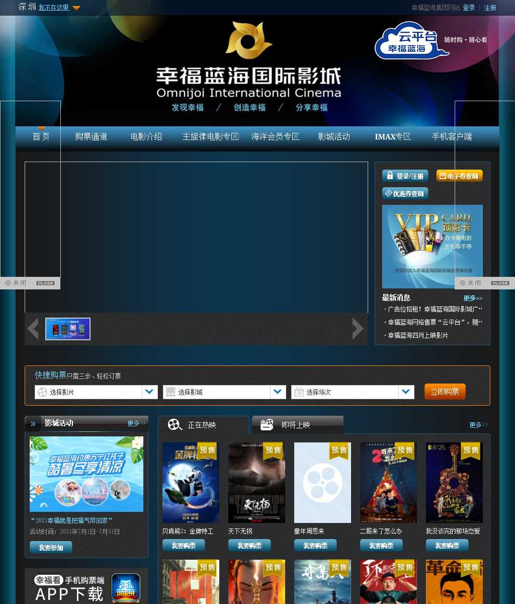 幸福蓝海国际影城官网是中国最专业的电影票网上预定购买网站,为广大影迷提供最新的影片排期查询,网上订电影票,在线订电影票,优惠折扣在线选座等功能,为企业提供电影票团购等服务,免费服务热线--