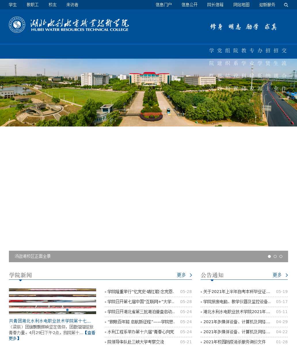 湖北水利水电职业技术学院是年经湖北省人民批准组建的公办普通高等职业院校,隶属于湖北省水利厅,是一所培养水利水电类专业人才为主的普通高等职业院校。近年来,湖北水利水电职业技术学院先后被湖北省委、省授予“省级文明单位”,被湖北省总工会授予“湖北五一劳动奖状”,被省教育厅授予“省级平安校园”、“社会综合治理先进单位”、“高校毕业生就业统计省级核查免检学校”等荣誉称号。年,湖北水利水电职业技术学院被确定为全国优质水利高等职业院校建设单位,2019年被确定为湖北省优质高等职业院校。
