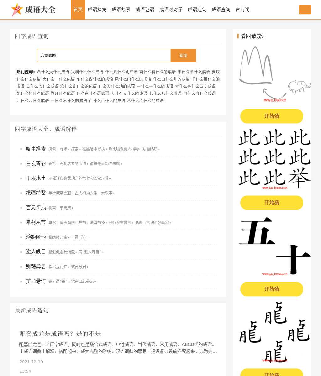 成语大全网让您方便的在线查询到您所需要的常用四字成语大全及解释,成语接龙大全个,成语故事大全篇,猜成语大全个图片。小学生成语大全例如数字成语,含有动物的成语,风景成语,颜色成语等各种形式的成语;按照字数区分四字、五字、六字、八字等多字成语。包括成语解释、在线读音、成语用法、成语出处、成语歇后语、成语谜语、成语故事动画、成语接龙等信息。