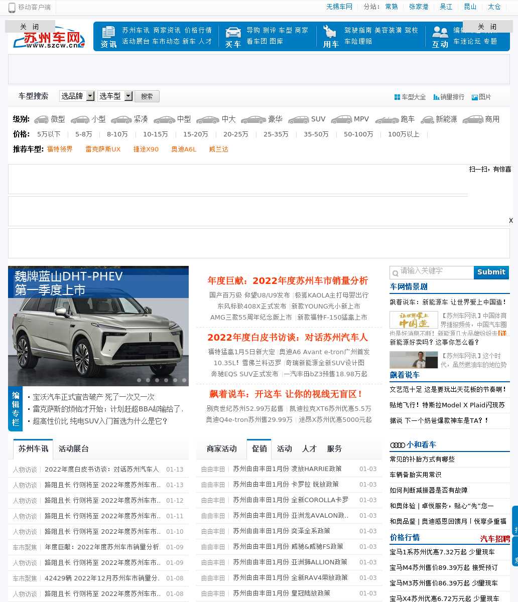 苏州车网为您提供苏州地区全面,及时的汽车新闻,汽车导购,汽车报价及车型参数配置,汽车图片,汽车行情,汽车试驾,汽车评测,汽车经销商信息,是苏州地区信息专业汽车网站