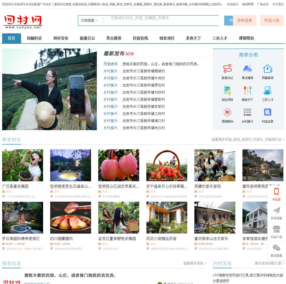 回村网专注乡村旅游,乡村文化,农村美食,观光农业,休闲养生,农产品推广,创业项目推荐,三农信息发布,用乡村互联服务平台来助力全国60多万乡村的产业创新与经济发展。