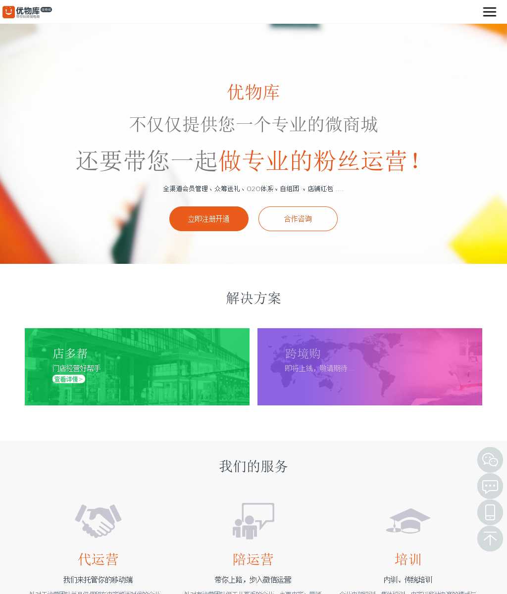 优物库,专注于微信粉丝深度运营的公司。不仅为商家提供一套的微商城系统,而且还配合粉丝管理、营销推广、分销等系统,为企业提供成体系的微信运营服务!