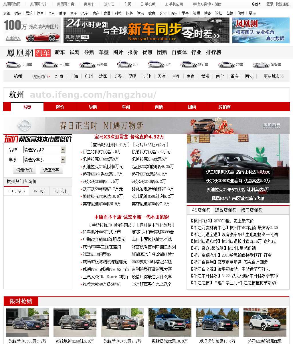 凤凰网汽车杭州网站为您提供最及时的杭州汽车报价、杭州汽车降价、杭州汽车导购、新闻、行情及杭州汽车经销商信息,以及杭州本地的汽车相关服务,是您选车买车用车的首选网站。
