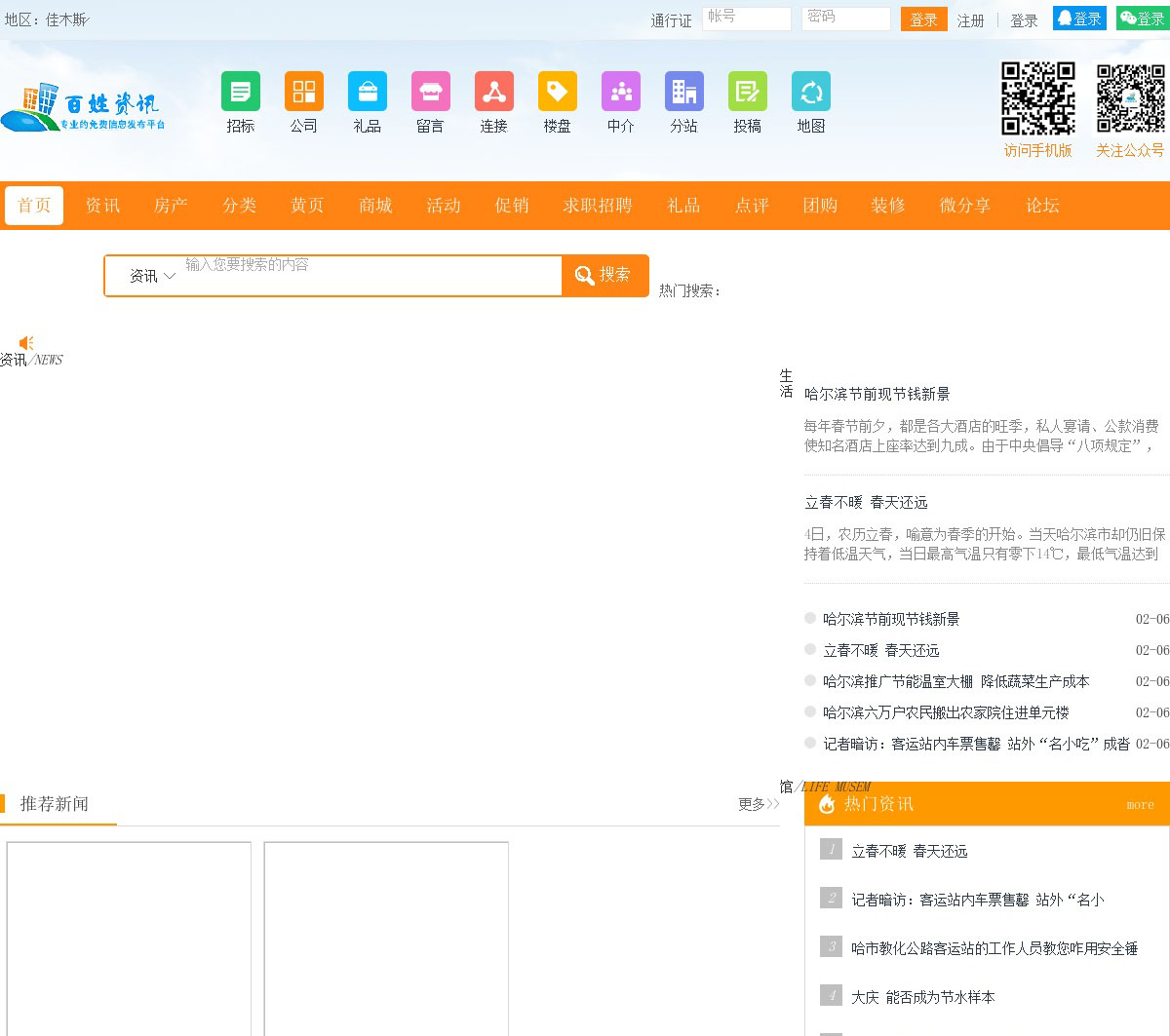 佳木斯百姓资讯网最好的地方门户以服务本地经济发展,向全国推广为己任,及时向市民传送各地区各类新闻资讯,房产楼盘,分类信息,同城购物,商家黄页,团购活动,优惠促销,求职招聘,打折团购,商家点评