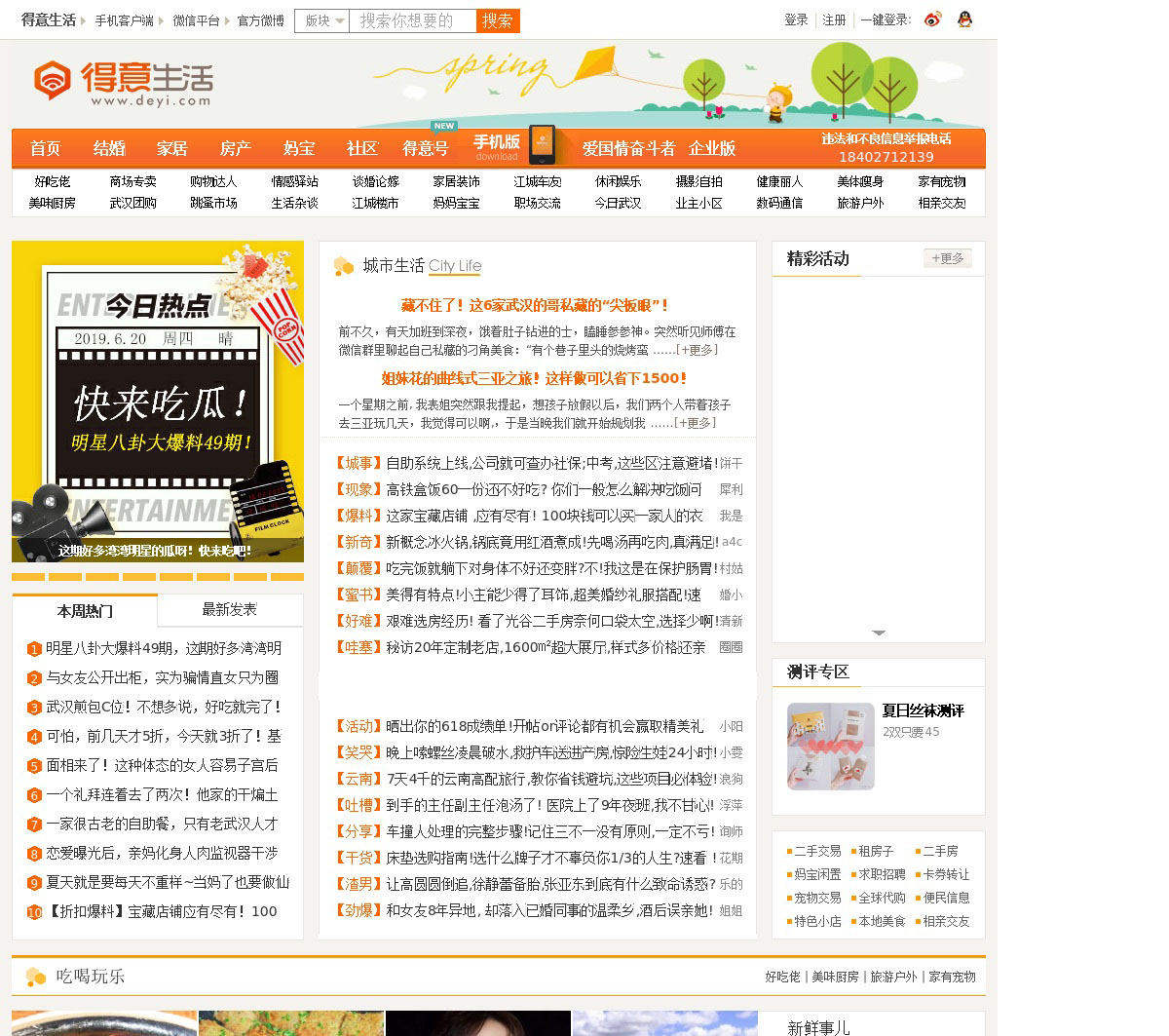得意生活(deyi.com)是武汉最大的本地生活交流与服务平台,提供最新最全的武汉打折、武汉团购、购物、房产、家装、母婴、婚纱摄影、女性写真、武汉交友、求职招聘、美食小吃、娱乐时尚、女性生活 ,得意生活-武汉生活消费社区
