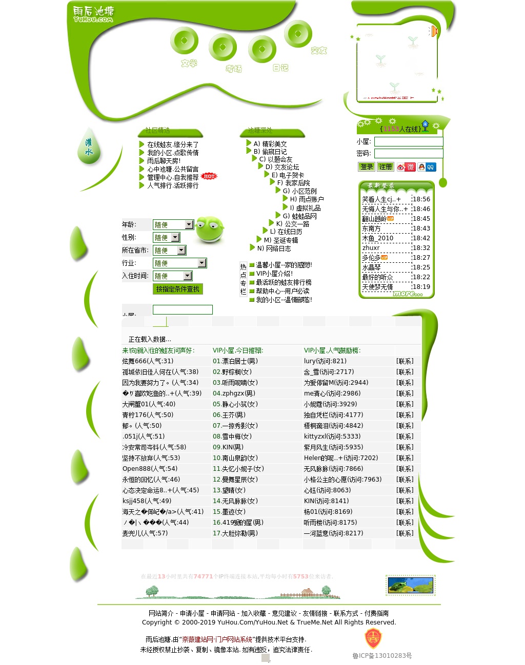 雨后池塘创建于2000年,是一个非常清新的社交网站。这里有遍及天涯海角的蛙友,一个女孩多过男孩的美丽的地方!