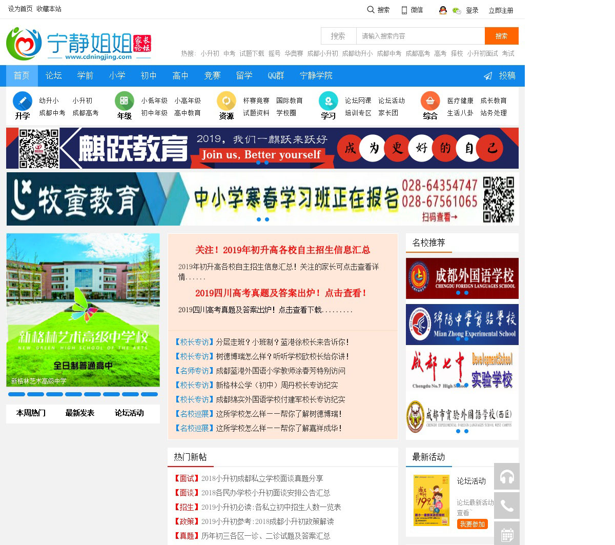 成都宁静姐姐家长论坛是川内最大的教育升学家长社区,专门为各年级家长们提供最全面最及时的成都幼升小,成都小升初,成都中考,成都高考,成都重点中学资讯、备考资料、试题真题等信息,以及各年级入学期中期末学习、复习、考试、资料等,欢迎各位家长和老师一起来交流与分享.