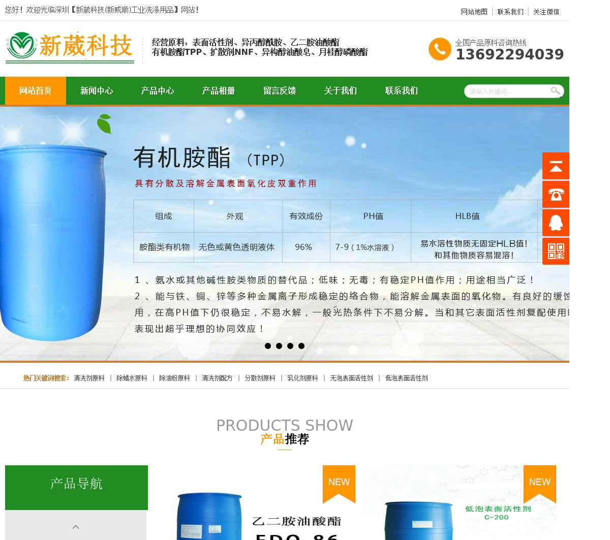 深圳新葳科技(表面活性剂原料)有限公司以生产加工为模式,致力应用于除蜡水化工原料、表面活性剂、清洗剂、化工试剂、洗涤材料、渗透剂、乳化剂除蜡水原料、表面处理、研磨剂、除蜡水、除油粉、清洗剂原料、除油剂、水基金属清洗剂、除蜡粉、洗涤原料等化工领域。