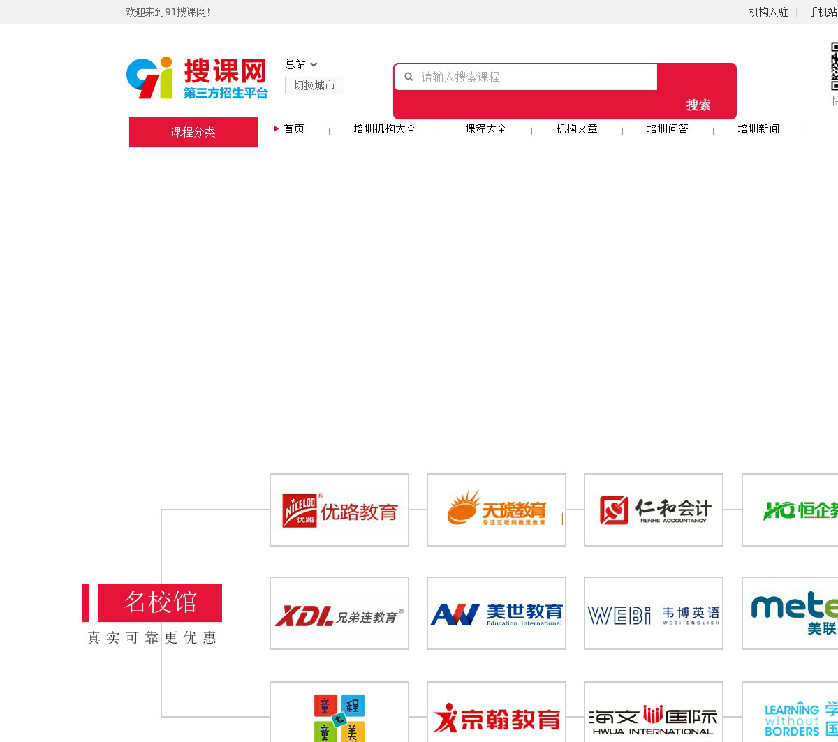 91搜课网是中国教育培训门户网站,累计成交学员超10万人次,提供培训学校排名和口碑。同时为培训机构提供高效的招生服务。本平台涵盖中小学辅导、英语、考证、留学、艺术等课程。