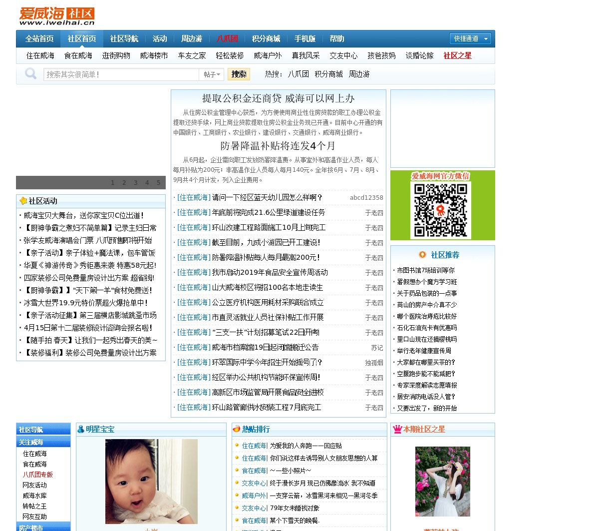 爱威海社区是威海的网上虚拟社区和论坛,是威海网友心目中的综合性bbs群和网上家园。社区主题版块涵盖生活、情感、文化、社会、时事、体育、娱乐等各个领域。