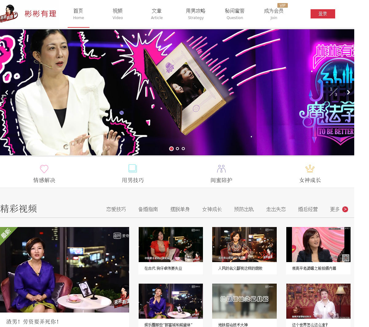 彬彬有理(binbinyl.com)中国首个女性情感励志自媒体视频脱口秀,旨在为都市白领提供脱单、恋爱、失恋、婚后生活经营等互动内容,是您摆脱情感困扰,实现自我解压的闺蜜和代言人。