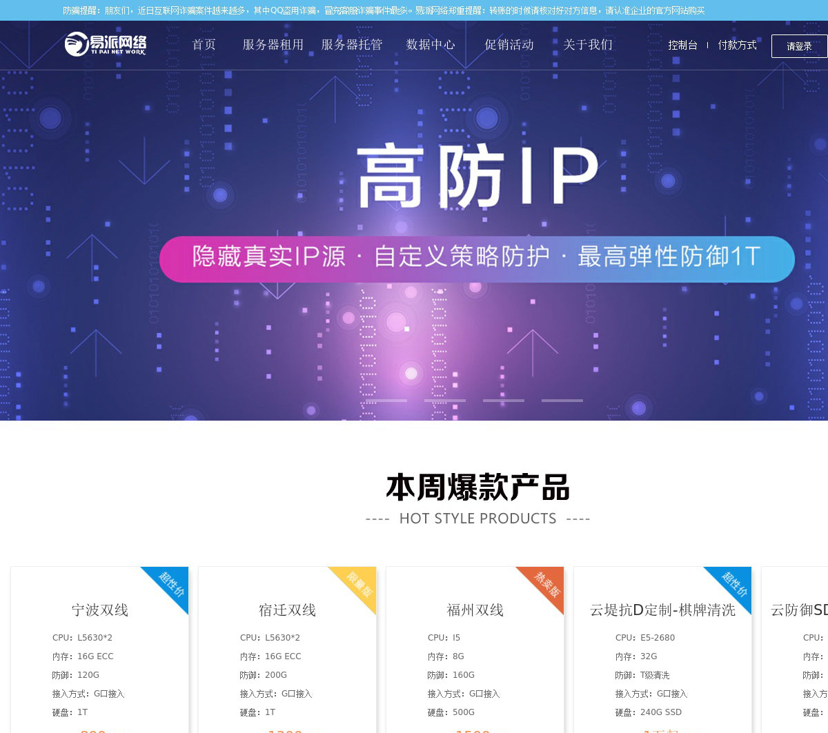 易派提供高防服务器租用、服务器托管、香港服务器、云防御、bgp服务器、美国服务器等服务。是一家互联网基础服务供应商,拥有全国领先的ddos攻击防护技术、全国idc/isp资质企业!