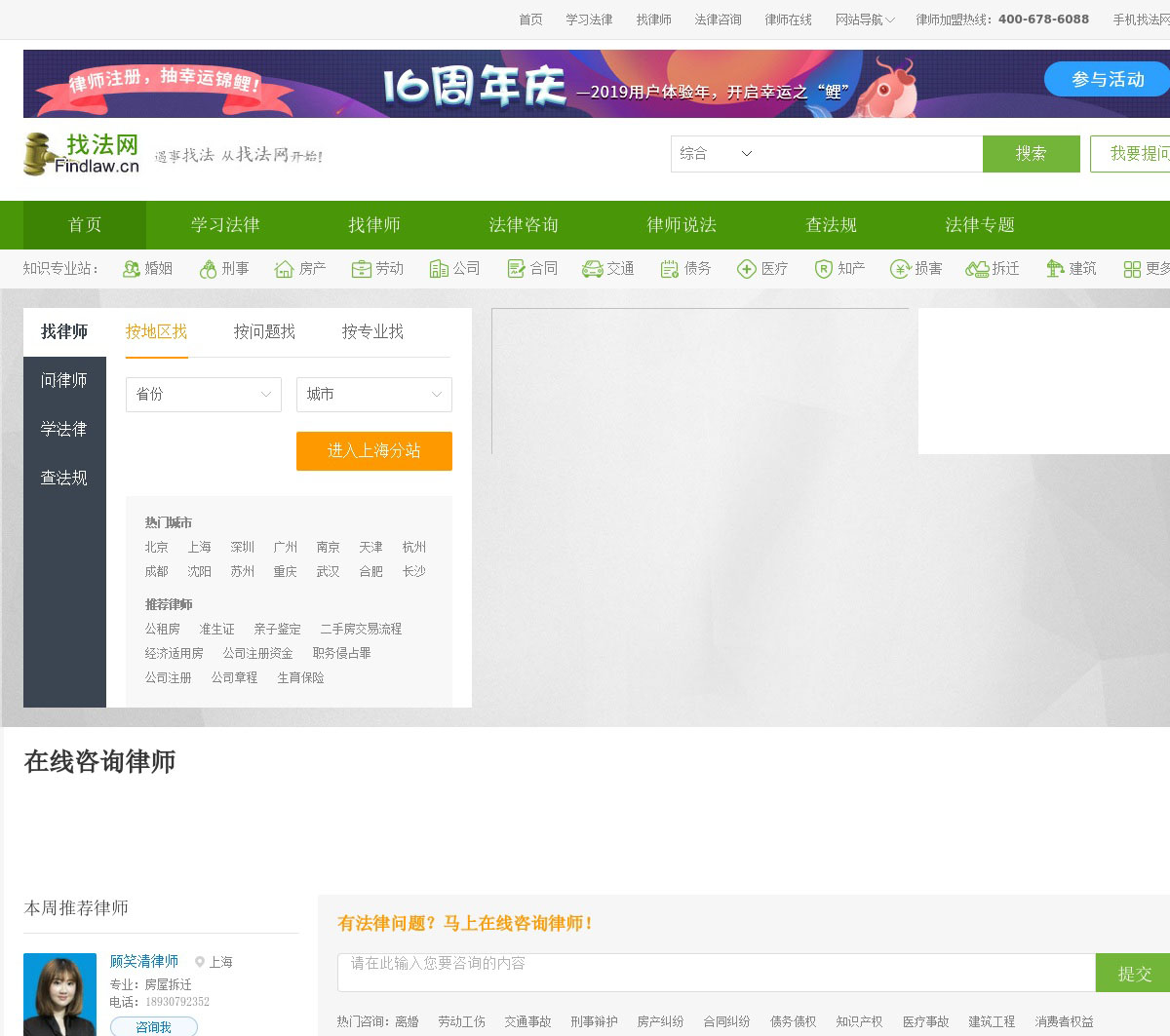 遇事找法,从找法网开始!15年法律咨询领导品牌,3164万需求者寻求帮助、在线找律师的第一站。找法网拥有注册律师近17万、年解答咨询量超过400万、年代理案件超20万,每天创造了超3万次的法律咨询互动,是律师实力强、信誉佳的法律服务平台。