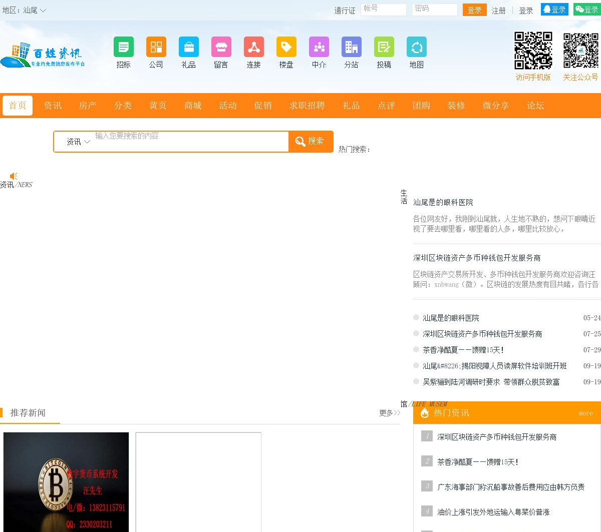 汕尾百姓资讯网以服务本地百姓生活、经济发展,及时向百姓传送各类新闻资讯、房产、楼盘、分类信息、购物、商家、黄页、团购、活动、优惠、促销、求职、招聘、美食、汽车、旅游、点评、二手信息等一系列的生活资讯,以及百姓心声、企业资讯等最好的地方门户服务的平台。