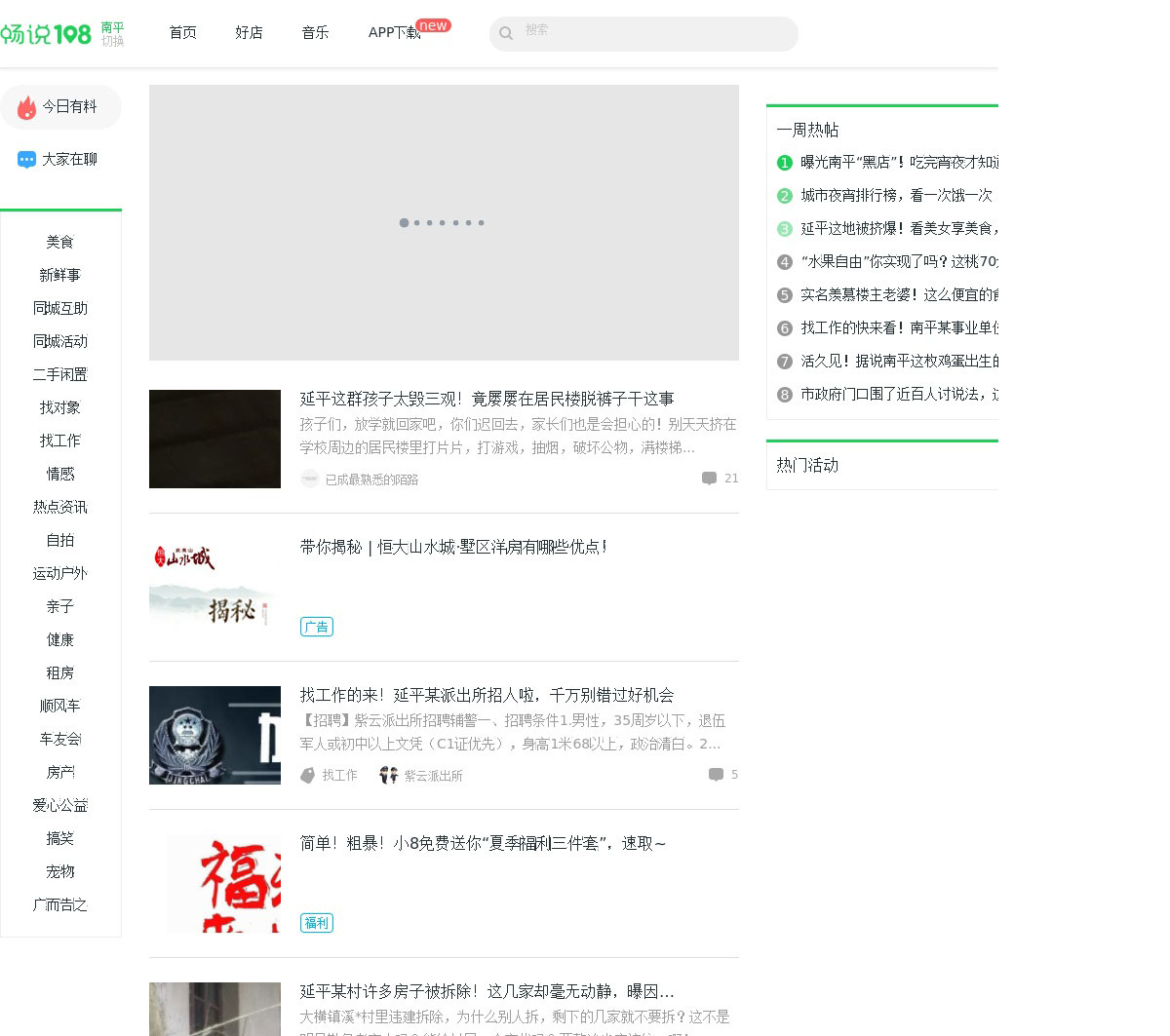 南平社区是南平本地人的生活论坛,随时随地分享身边事,聊天交友,爆料花边,这里汇聚了南平本地最活跃的达人用户,涉及房产招聘,车辆交易,相亲运动,教育培训,车友活动,爱心公益,生活互助各个方面,看本地新鲜事,就上社区,客服qq: