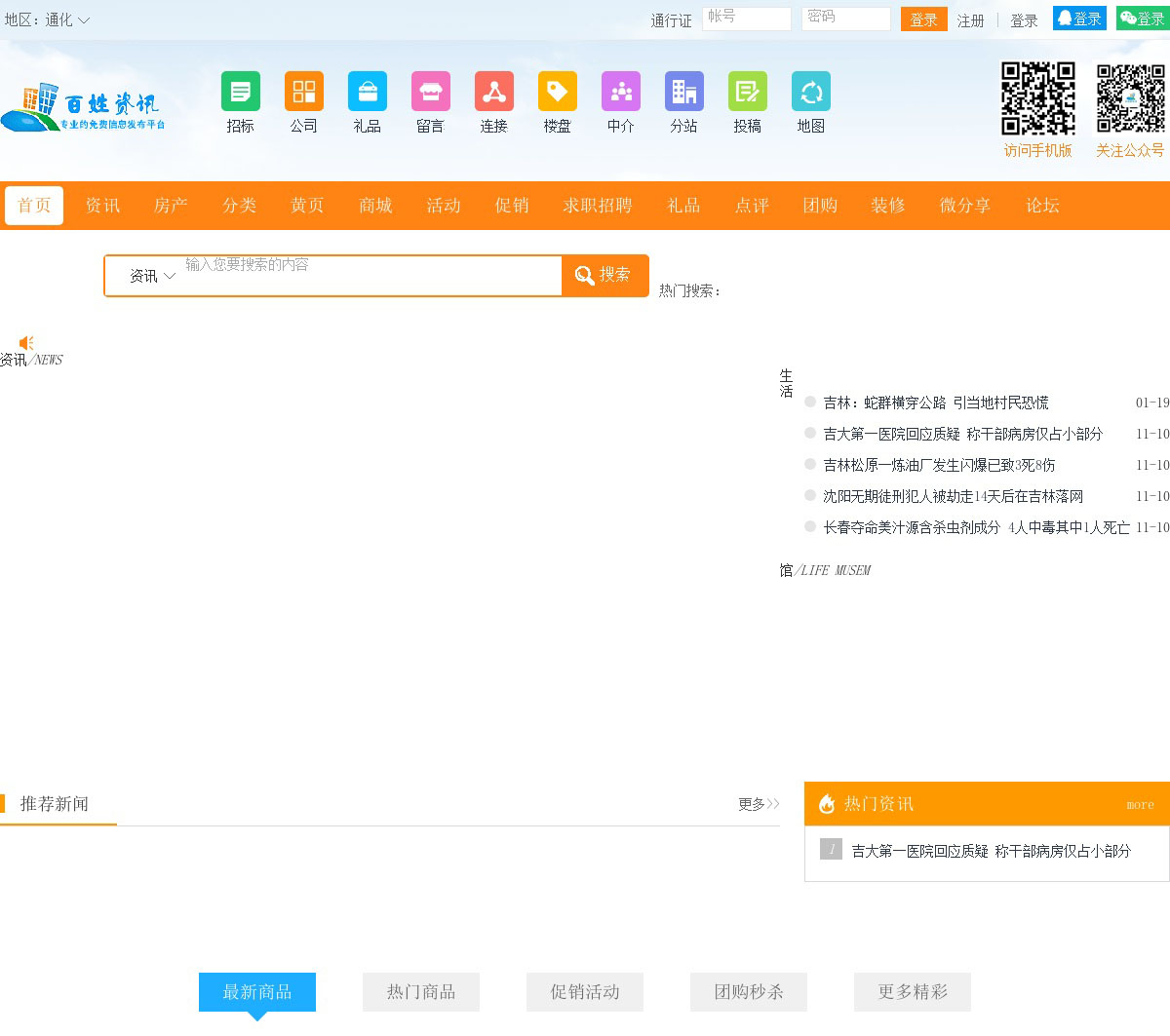 通化百姓资讯网最好的地方门户以服务本地经济发展,向全国推广为己任,及时向市民传送各地区各类新闻资讯,房产楼盘,分类信息,同城购物,商家黄页,团购活动,优惠促销,求职招聘,打折团购,商家点评,二手信息等