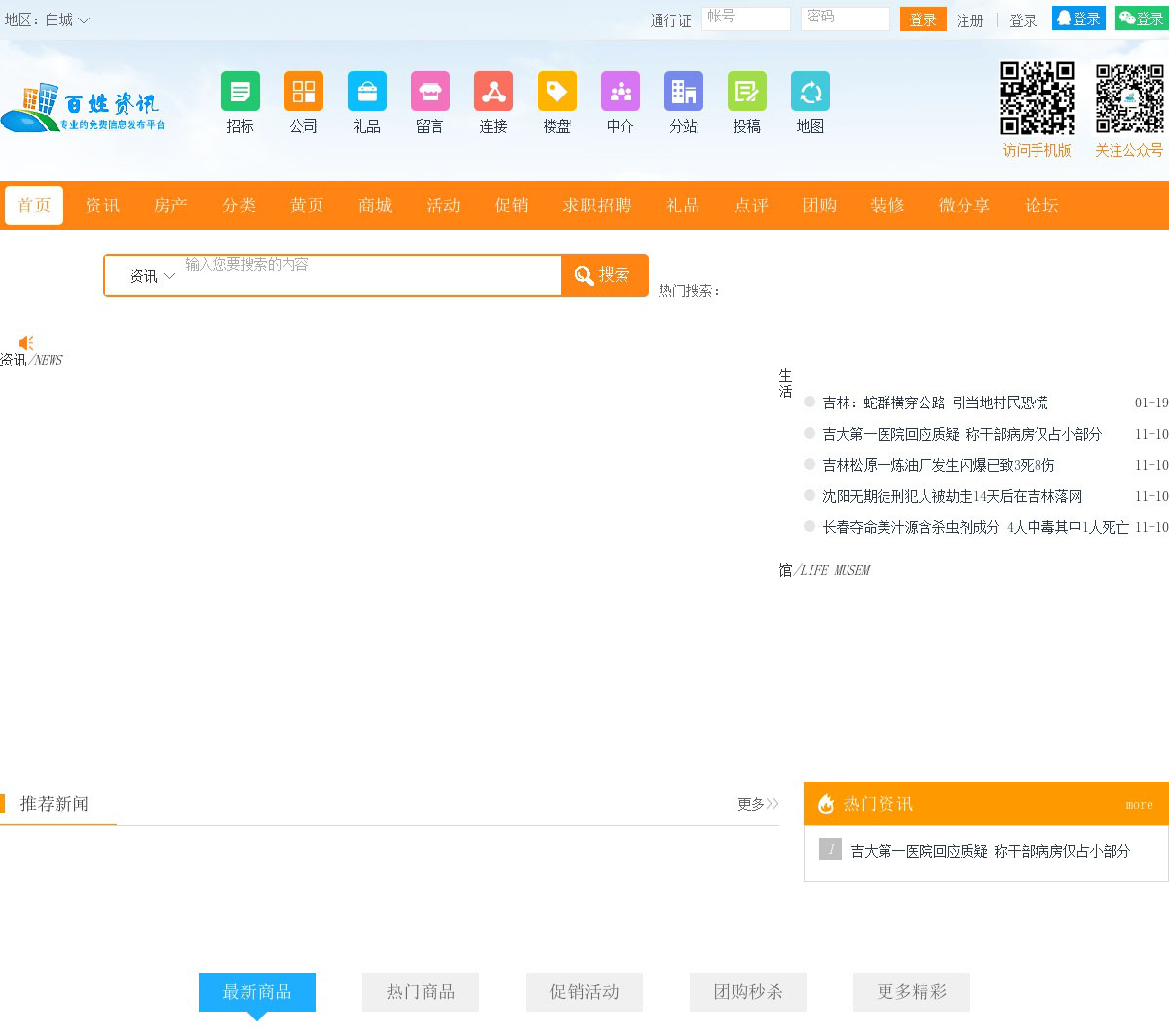 白城百姓资讯网最好的地方门户以服务本地经济发展,向全国推广为己任,及时向市民传送各地区各类新闻资讯,房产楼盘,分类信息,同城购物,商家黄页,团购活动,优惠促销,求职招聘,打折团购,商家点评,二手信息等