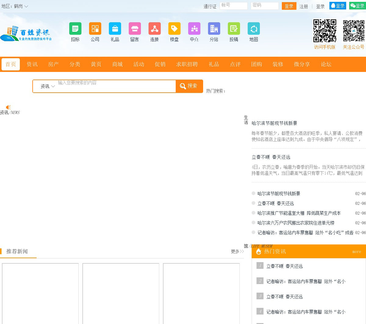 鹤岗百姓资讯网最好的地方门户以服务本地经济发展,向全国推广为己任,及时向市民传送各地区各类新闻资讯,房产楼盘,分类信息,同城购物,商家黄页,团购活动,优惠促销,求职招聘,打折团购,商家点评,二手信息等