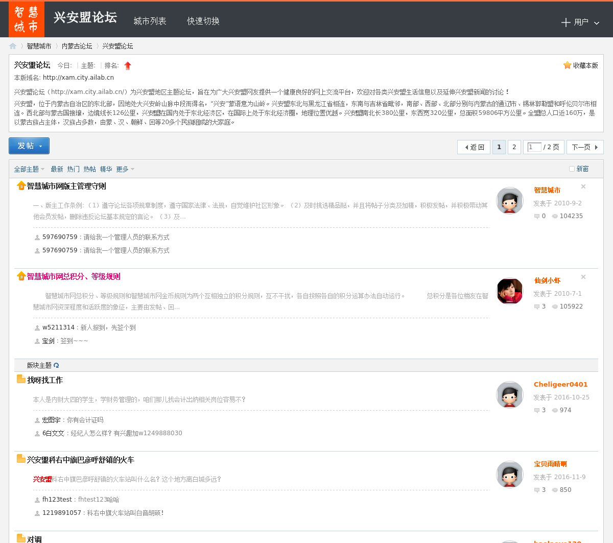 兴安盟论坛 (http://xam.city.ailab.cn/)为兴安盟地区主题论坛,旨在为广大兴安盟网友提供一个健康良好的网上交流平台,欢迎对各类兴安盟生活信息以及延伸兴安盟新闻的讨论 !兴安盟,位于内蒙古自治区的东北部,因地处大兴安岭山脉中段而得名,“兴安”蒙语意为山岭。兴安盟东北与黑龙江省相连,东南与吉林省毗邻,南部、西部、北部分别与内蒙古的通辽市、锡林郭勒盟和呼伦贝尔市相连。西北部与蒙古国接壤,边境 ...