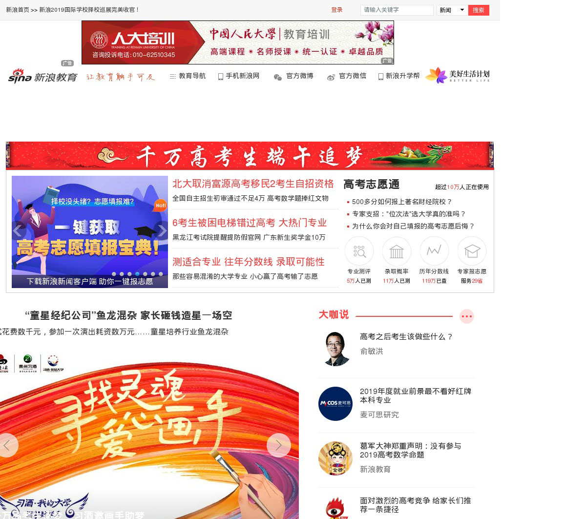 新浪教育频道是互联网教育门户,为学生及其家长提供一站式考试、升学、择校、家庭教育指导类资讯、新媒体、产品及服务,设有中小学、国际学校、出国留学、商学院、外语、教育视频、院校库、试题库等栏目。自创新浪中国教育盛典、五星金牌教师评选、五星金牌顾问评选、新浪中国教师盛典等品牌活动及《家长课堂》、《校长来了》等ip内容。考试服务覆盖高考、考研、公**、幼升小、小升初、中考、英语四六级、托福、雅思、会计等**报道,并提供高考志愿通、新浪升学帮等产品。