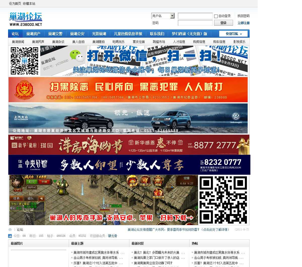 巢湖论坛(www..net)-又名巢湖社区,自年建立至今一直是巢湖百姓关注度颇高,创办较早的巢湖论坛。涵盖巢湖人民最最关心的巢湖百姓论坛、巢湖人论坛、巢湖新闻、巢湖天气、巢湖房产、巢湖同城游戏、巢湖社区等相关的巢湖民声主题!