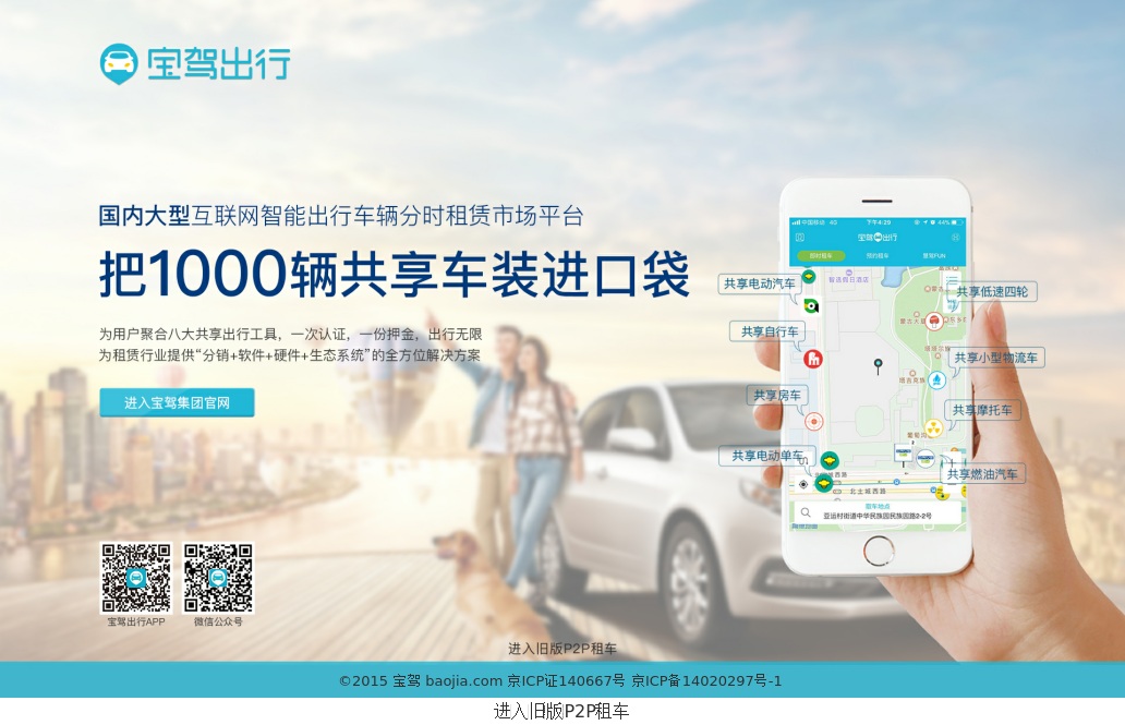 宝驾出行,全国最大智能出行市场平台,聚合八大共享交通工具:共享汽车、共享电动汽车,共享电动单车,共享低速汽车,共享货车,共享摩托车等
