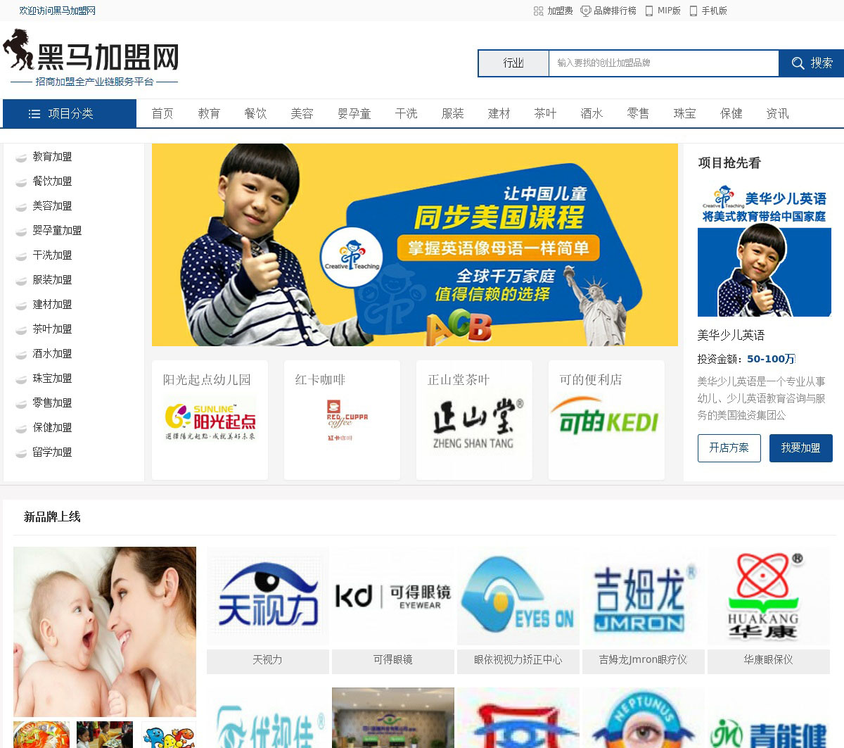 黑马加盟网是一个集招商和加盟为一体的综合性质的服务平台,已经拥有教育、餐饮、美容、干洗、婴孕童等十几个服务行业,汇集了成百上千个优秀加盟品牌,想快速招商、轻松创业就上黑马加盟网。