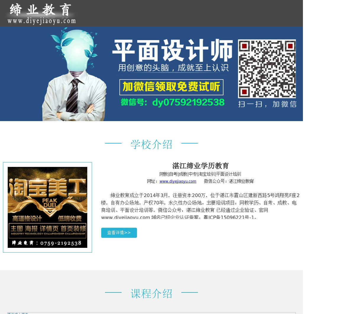 湛江缔业教育是湛江成人高考,网络教育,自学考试,ps培训,cdr软件培训,电脑培训,电商培训,化妆培训,平面设计师培训,淘宝美工培训、网商运营培训的专业培训机构等课程品牌课程机构