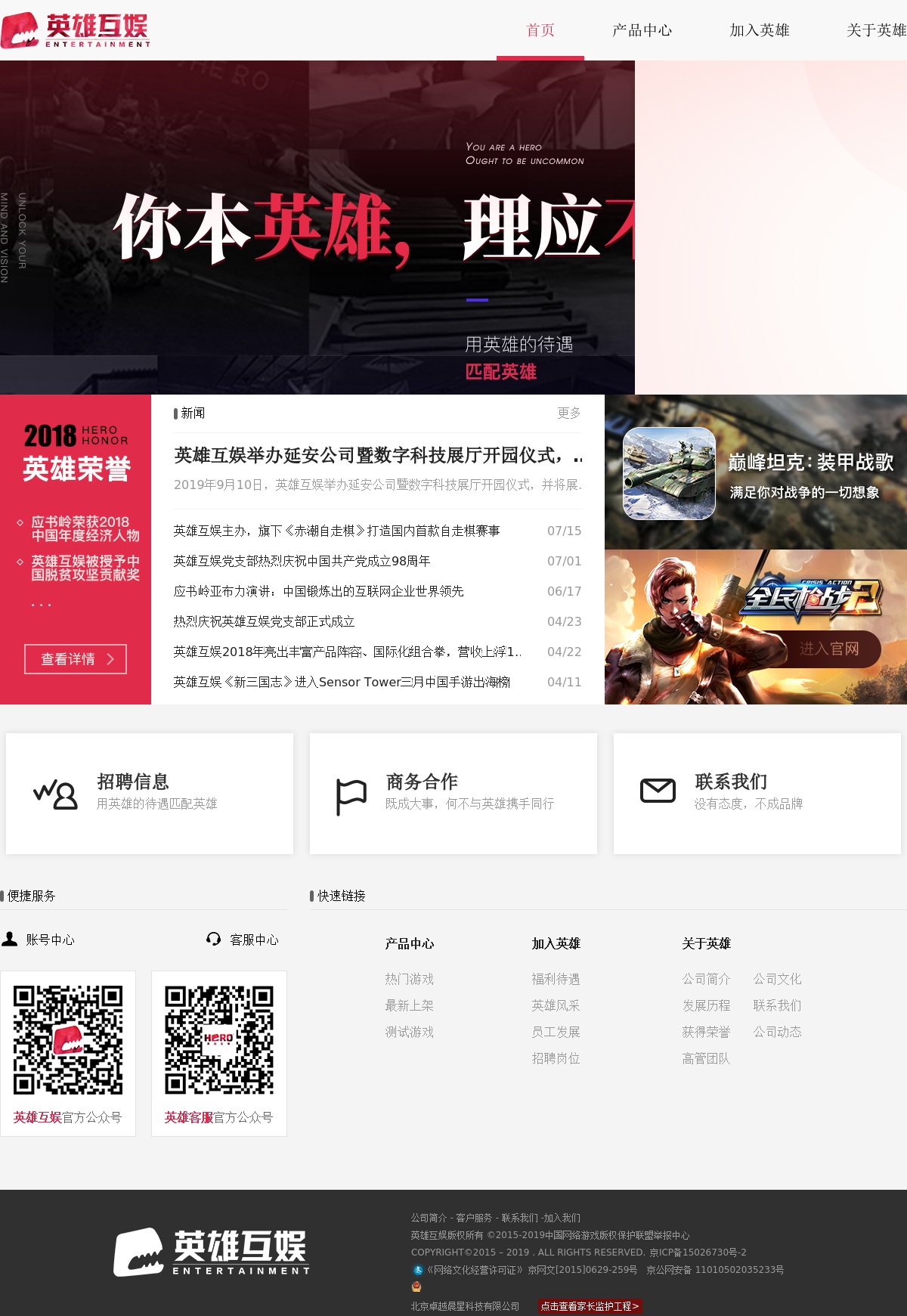 北京英雄互娱科技股份有限公司,成立于2015年6月16日,是全球领先的互动娱乐品牌。基于全球化的视野,立足于移动互联网时代,英雄互娱致力于为海内外用户提供优质的移动游戏。以泛娱乐为战略目标,推广“移动电竞”概念,打造全方位的移动电竞娱乐方式,开创全民互动娱乐新时代。