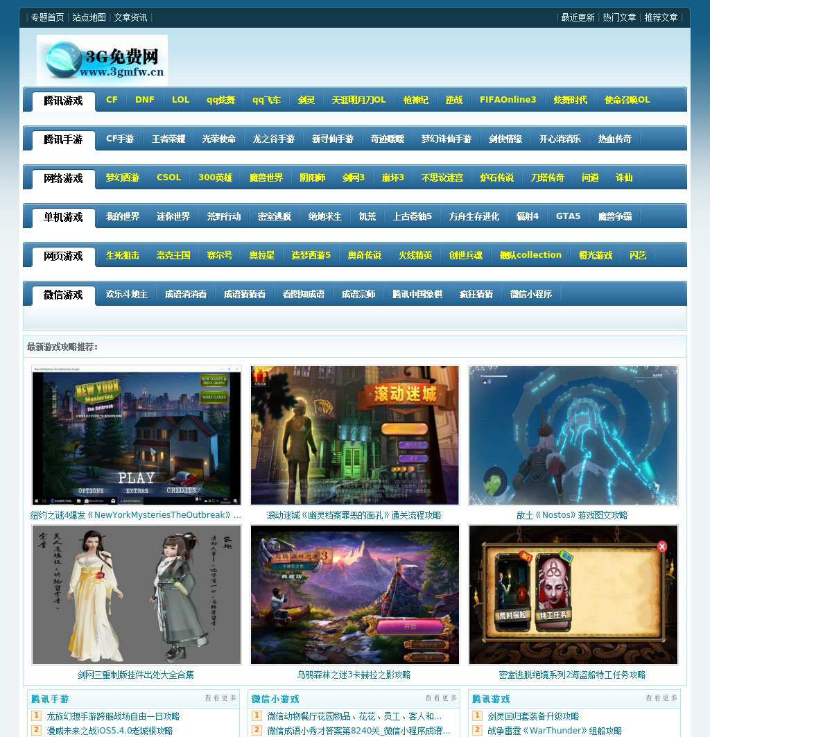 3G免费网分享最好玩最热门的微信小程序游戏和手机游戏攻略,主要分类为微信游戏、腾讯游戏、腾讯手游、网络游戏、单机游戏、网页游戏、密室逃脱游戏及橙光游戏。