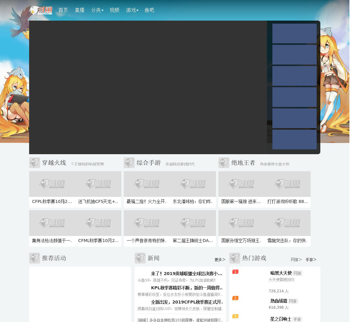 斗鱼 - 每个人的直播平台提供高清、快捷、流畅的视频直播和游戏赛事直播服务,包含英雄联盟lol直播、穿越火线cf直播、dota2直播、美女直播等各类热门游戏赛事直播和各种名家大神游戏直播,内容丰富,推送及时,带给你不一样的视听体验,一切尽在斗鱼 - 每个人的直播平台。