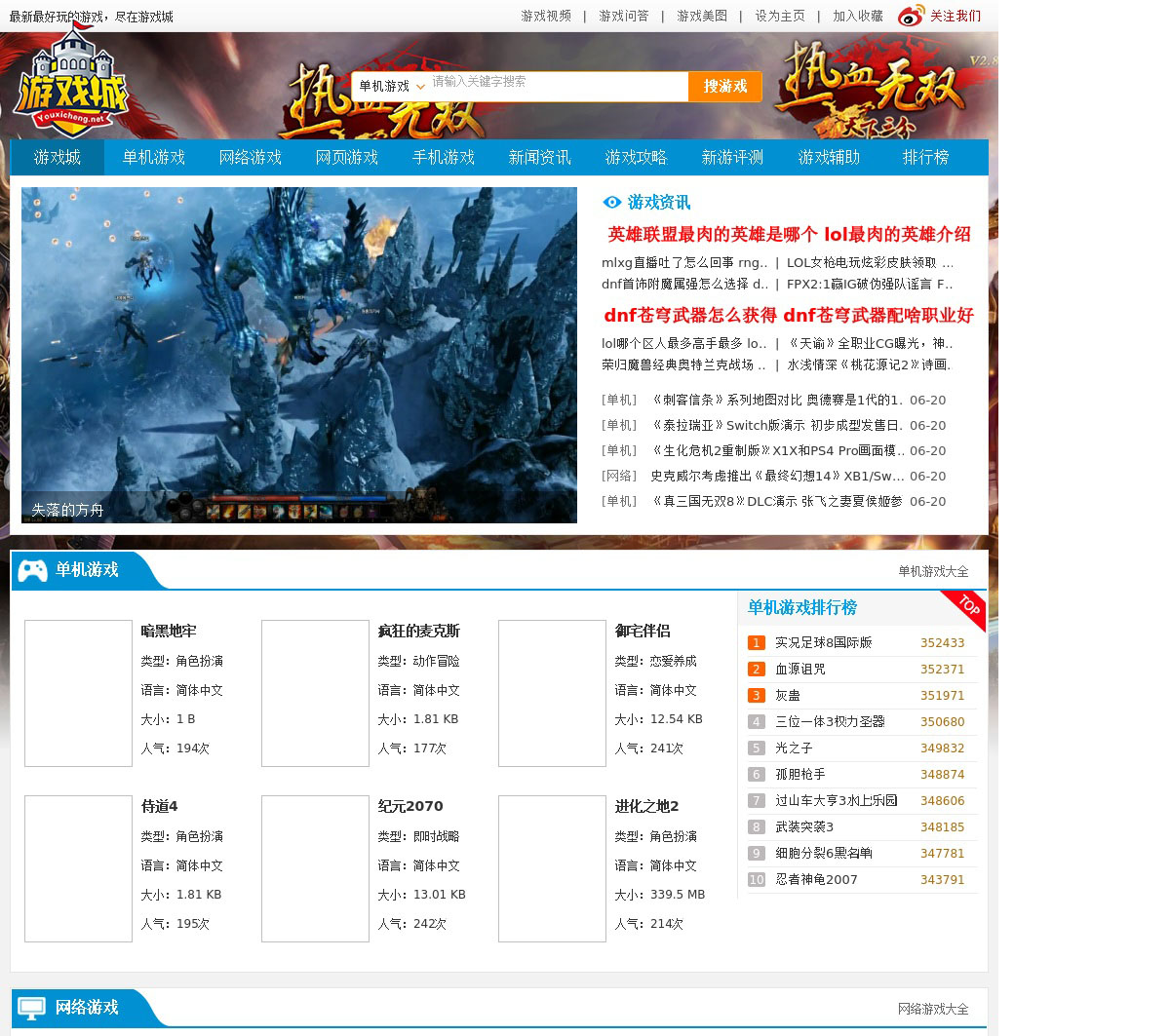 游戏城-中国最专业游戏网,好评率94%;提供单机游戏、网络游戏、网页游戏下载服务,拥有丰富的游戏攻略资料、补丁、辅助工具、视频、图片,服务于百万游戏玩家。
