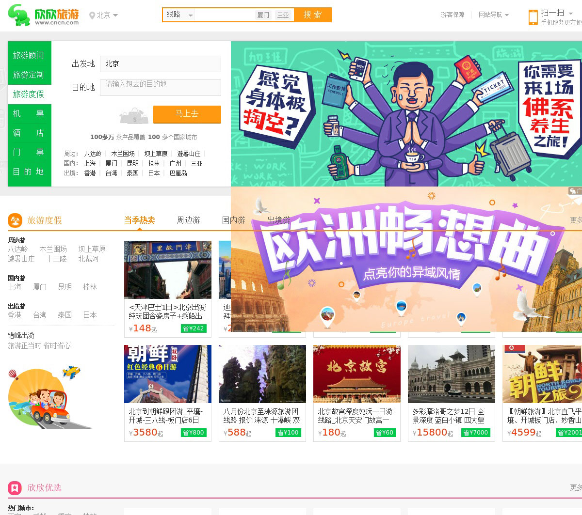 欣欣旅游网(CNCN.com)中国在线旅游超市为您提供100多万条旅游线路、门票、签证、酒店等预订服务…为您量身定制不一样的旅行…更新时间:19-11-11 20:20:53