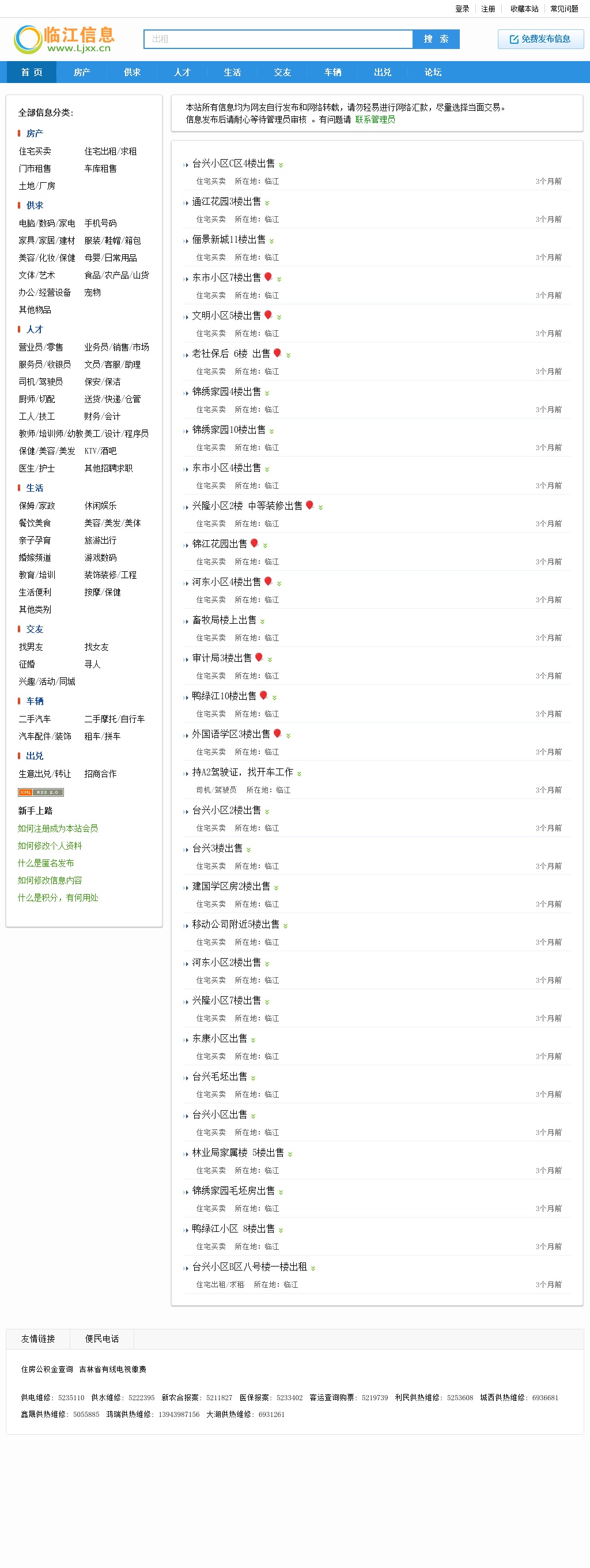 临江信息网,吉林省临江市信息网站。栏目设置:房产、人才、供求、车辆、交友、招生、服务、资讯。