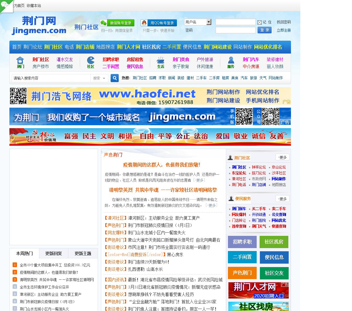 荆门网(jingmen.com)是荆门社区网络门户。荆门网提供荆门人才网、房产、装修、交友、旅游、二手、汽车、拼车、社区找房、网站建设等荆门社区服务。电话:-
