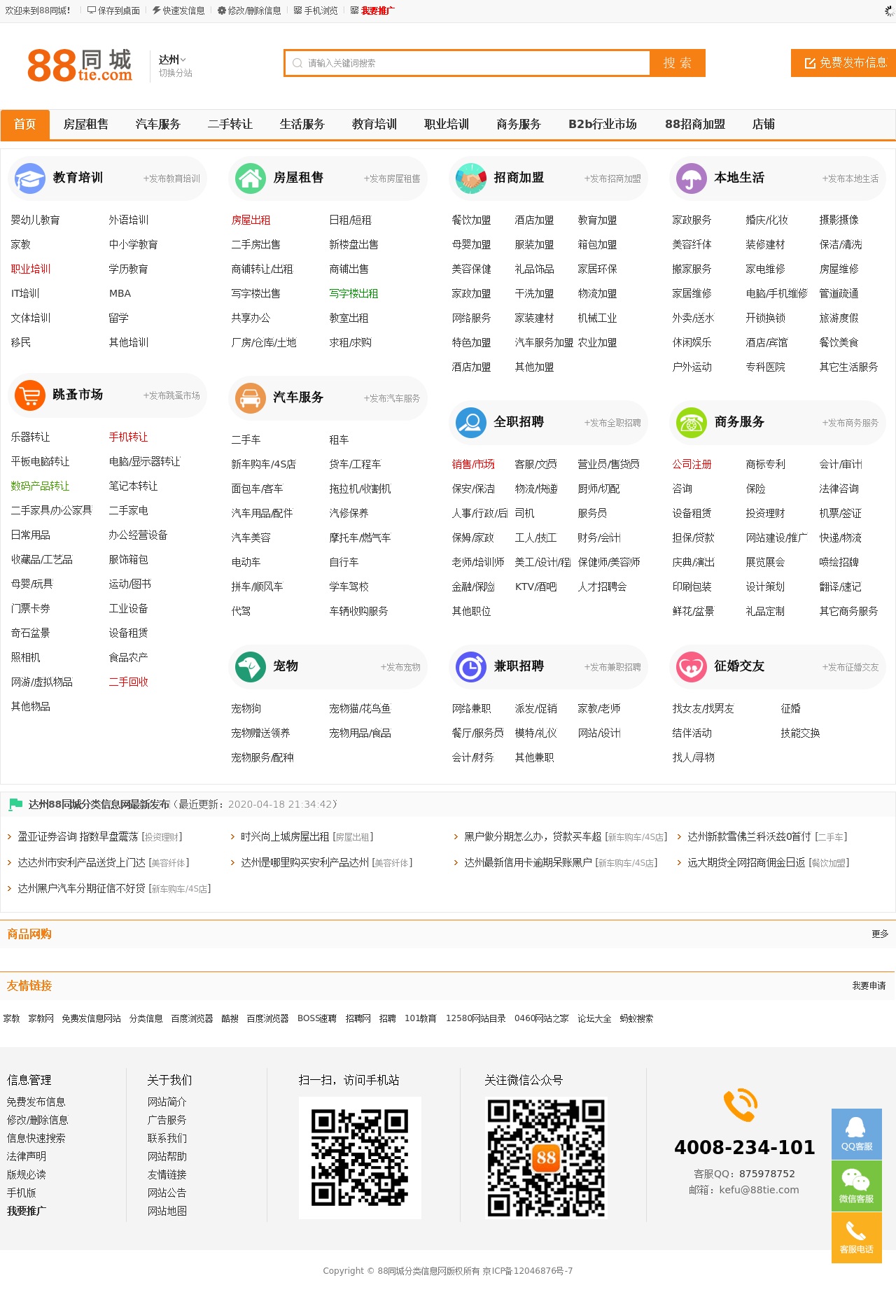 88同城,老百姓的便民生活服务分类信息网,免费发布信息平台。为您提供二手物品交易、二手车买卖、房屋租售、宠物、招聘、兼职、生活服务等城市分类信息和免费发布信息平台。