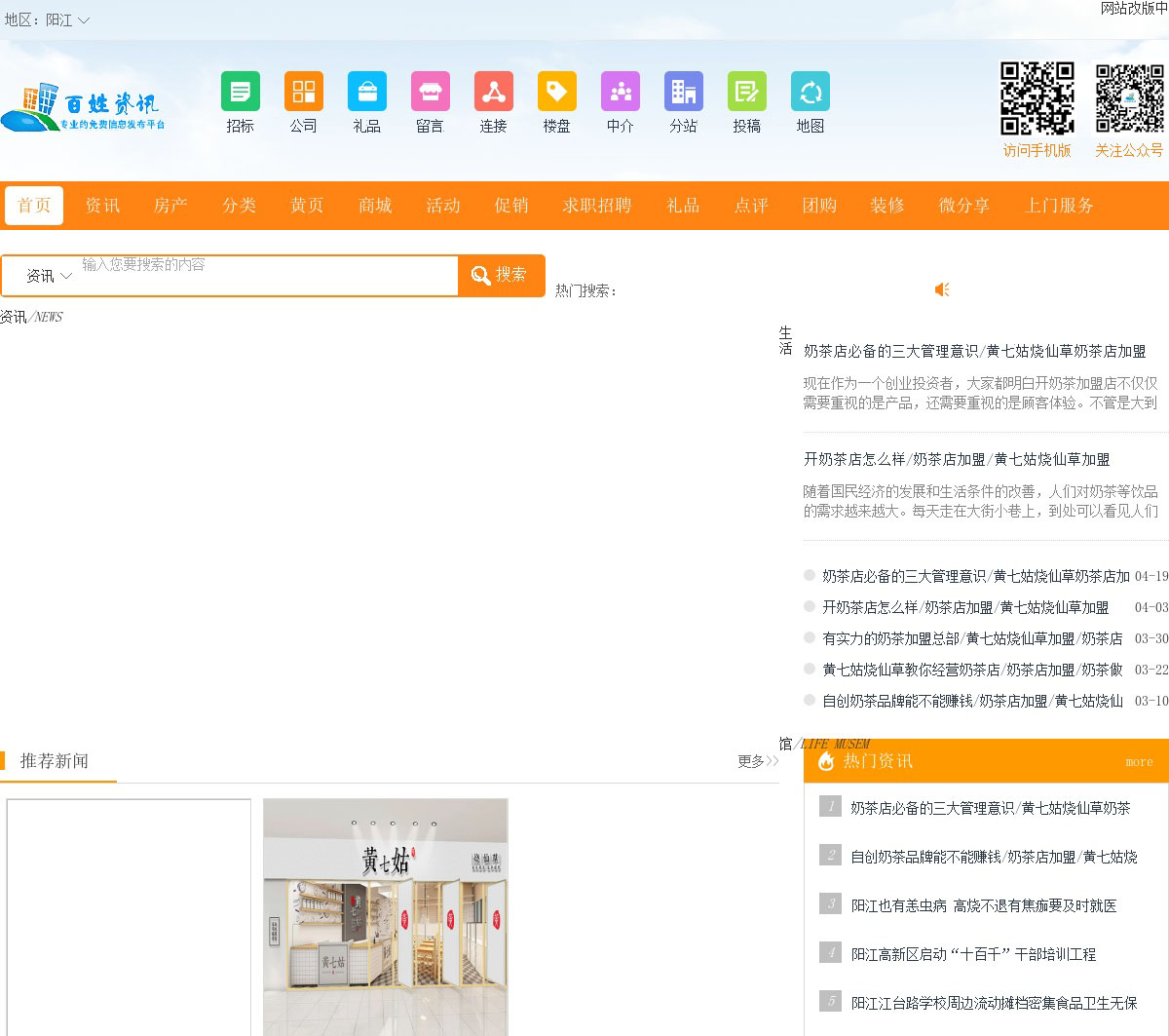 阳江百姓资讯网以服务本地百姓生活、经济发展,及时向百姓传送各类新闻资讯、房产、楼盘、分类信息、购物、商家、黄页、团购、活动、优惠、促销、求职、招聘、美食、汽车、旅游、点评、二手信息等一系列的生活资讯,以及百姓心声、企业资讯等最好的地方门户服务的平台。
