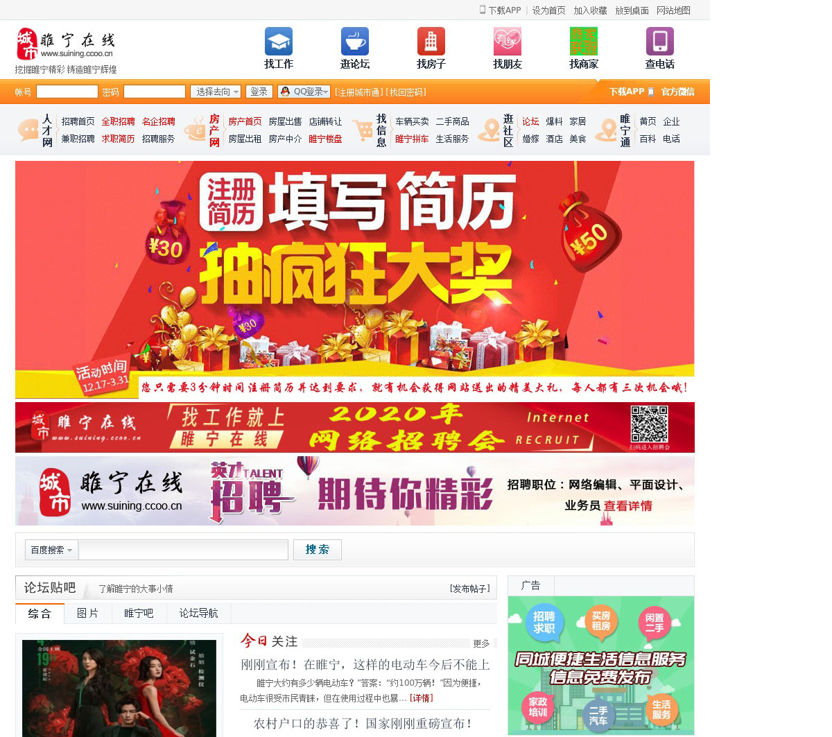 睢宁在线,睢宁综合信息门户,为您提供睢宁旅游特产、小吃美食、新闻热点、房产新楼盘、招聘求职、家居建材装修、婚嫁影楼、论坛贴吧、商家企业黄页电话、睢宁天气、睢宁电影院影讯等综合信息。
