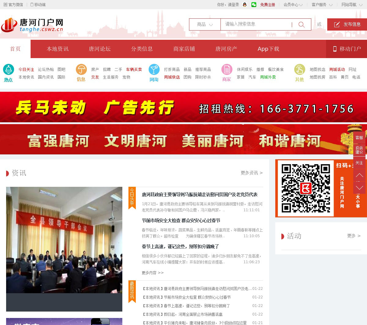 唐河门户网是唐河县最好的地方门户网站,内容覆盖唐河新闻资讯、商家、招聘等,设有二手交易、房产、唐河论坛等多个频道,为发展繁荣传播唐河本土文化等提供自由互动交流空间。