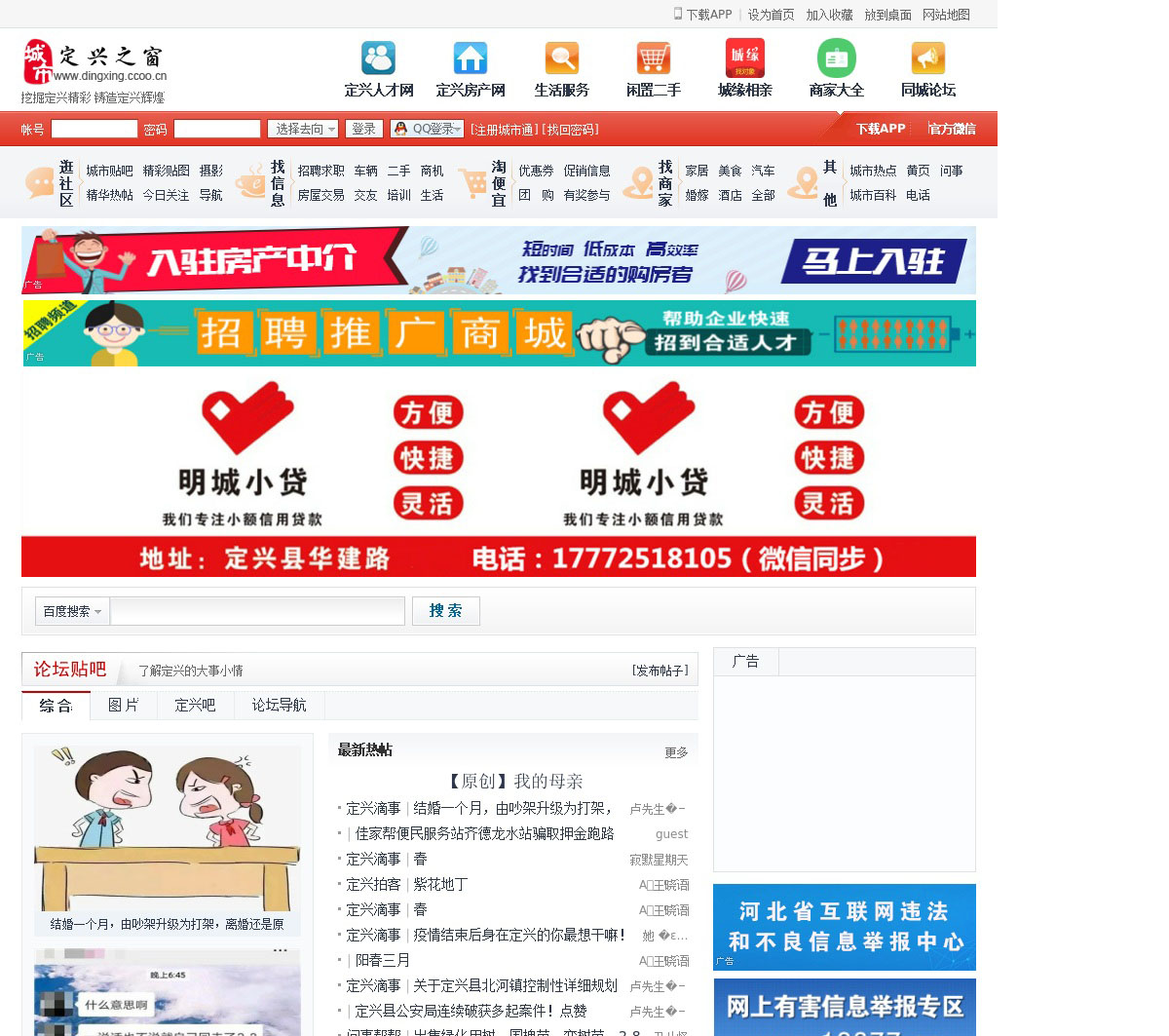 定兴之窗,定兴同城网,汇集定兴新闻资讯,社区论坛,人才招聘,房产交易,打折促销,团购活动,电子优惠券,电话黄页等综合信息。定兴人的网上家园,尽在定兴之窗www.dingxing.ccoo.cn