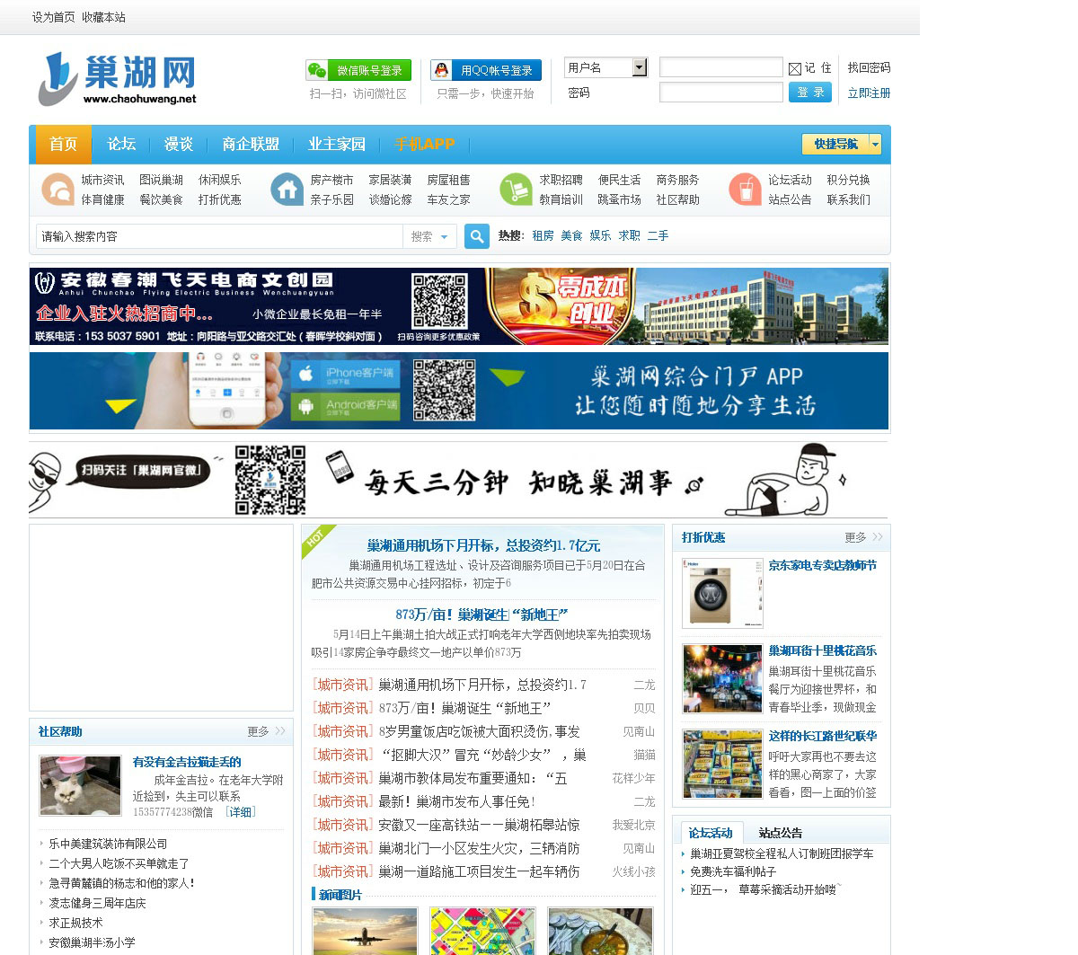 巢湖网立足于服务社会、为民惠民、满足百姓需求为目标,发布及时、准确、权威的生活信息,提供方便、易用、周到的城市服务。涵盖城市资讯、图说巢湖、社区帮助、休闲娱乐、餐饮美食、求职招聘、房屋租售等18个领域的公共服务。努力打造为巢湖本土专业的生活信息发布平台和巢湖人的网上家园!
