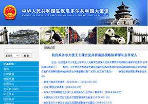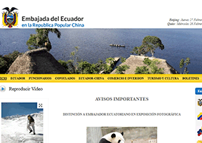 该网站为厄瓜多尔驻华大使馆(Embassy of Ecuador in China)的官方网站,主要提供使馆简介、使馆概况、最新动态、领事服务信息、中厄关系、商贸与投资、旅游与文化、时事信息等。网站语言有中文、西班牙文、英文三种。...